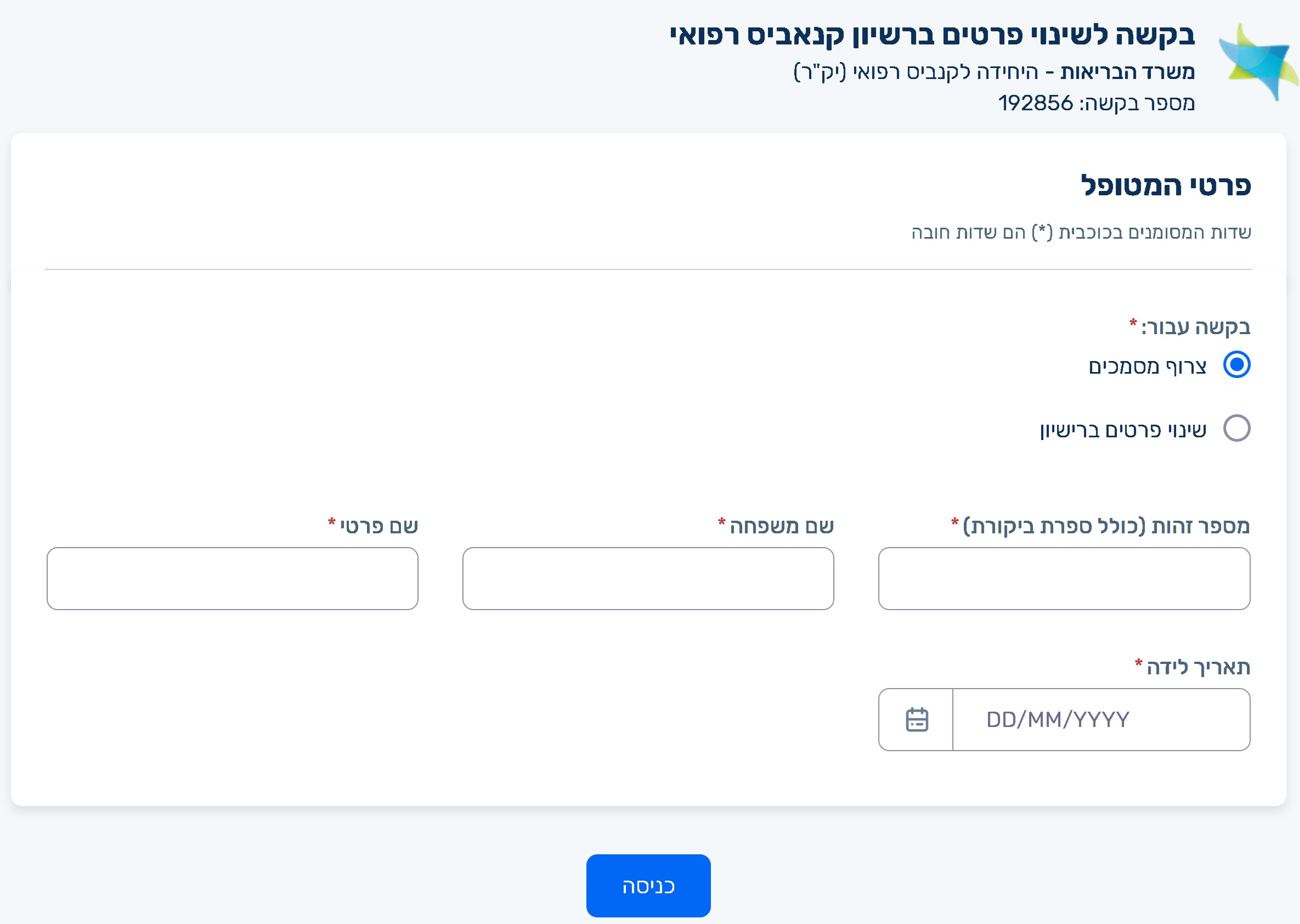 למטופלי קנאביס רפואי בעלי רישיון או מרשם שפג תוקפם ורוצים לחדש, להעלות מינון, לשנות ריכוזיות, או להוסיף/להסיר משנע ברישיון או במרשם קיימים.