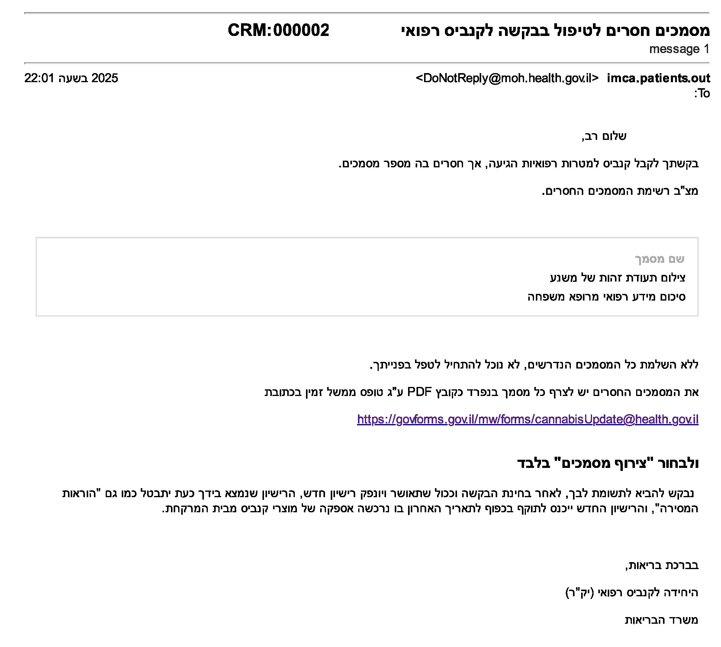 שולחים אלינו את המכתב המצורף למייל (doctorLetter), בו מוסבר הסיבות לדחייה, אנו נסייע לכם להבין מה הבעיות וכיצד ניתן לפתור אותם בצורה מקצועית לשביעות רצונם, פנו אלינו בהקדם ישר לאחר קבלת מכתב ואל תחכו לסיים את הארכה המנהלית שקבלתם, שיהיה לנו את הזמן לטפל לכם בבעיה ולא תהיו באוויר ולא מרשמים בתוקף.